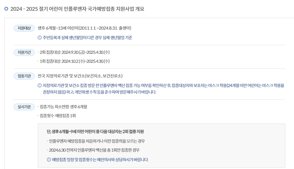 2024-2025절기 인플루엔자 국가예방접종이 2024년 9월 20일부터 2025년 4월 30일까지 실시됩니다.